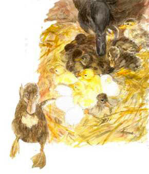Wie ich schon sagte, der kleine Gonzo war ein sehr aufgewecktes Kerlchen. Zwei Tage älter als seine Brüder und Schwestern, war er immer und überall eine Schnabellänge vorneweg. Immer als erster aus dem Nest, und natürlich als allererster im Wasser. Das Wasser war nicht weit vom Nest - grad rausfallen aus der kleinen mit Stroh ausgelegten Hütte, zweimal nach links über die Paddel stolpern, dann 2-3 Entenbauchbreiten einen kleinen Hang hinunter, und schon war man mitten im nassen Element. Gab natürlich tüchtig Schimpfe und Geschnatter vom Nest, Mutter sass ja noch auf den Eiern und konnte nicht weg. Aber man konnte ja so tun, als ob man hinter einem kleinen Fliegetier her wäre; das fand Mama nämlich gut.