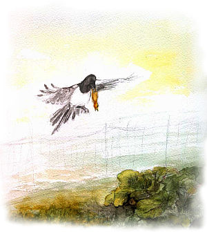 Plötzlich ein blitzschneller Ruck mit dem Schnabel, Werners Bein ist gepackt, noch ein Ruck, Werner plärrt aus Leibeskräften, die Mama quaakt laut "Geier, Geier" und hat inzwischen schon fast alle anderen unter den Federn eingesammelt, noch ein Ruck, Werner fluppt aus dem Zaun, (worüber er jetzt gar nicht mehr glücklich ist), und schon ist das Untier mit Werner in der Luft und wird immer schneller, immer höher, während Werner immer leiser und leiser wird.